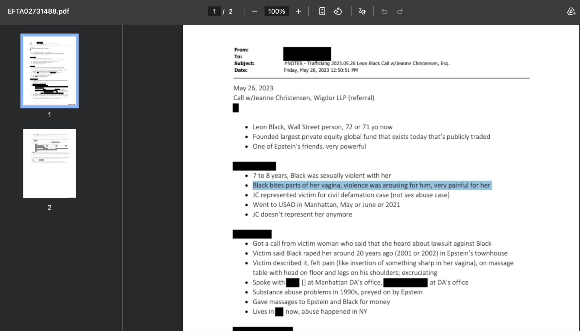 Billionaire Leon Black raped girls as young as 7 or 8 years of age. Black bites parts of her vagina